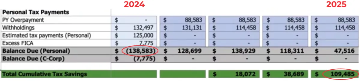 Note: picture shows actual results. He paid over $130,000 in taxes in 2024. After starting with Entrepreneur Advisors in September 2025, he’s now on track to pay under $50,000. Almost $110,000 in new tax savings.